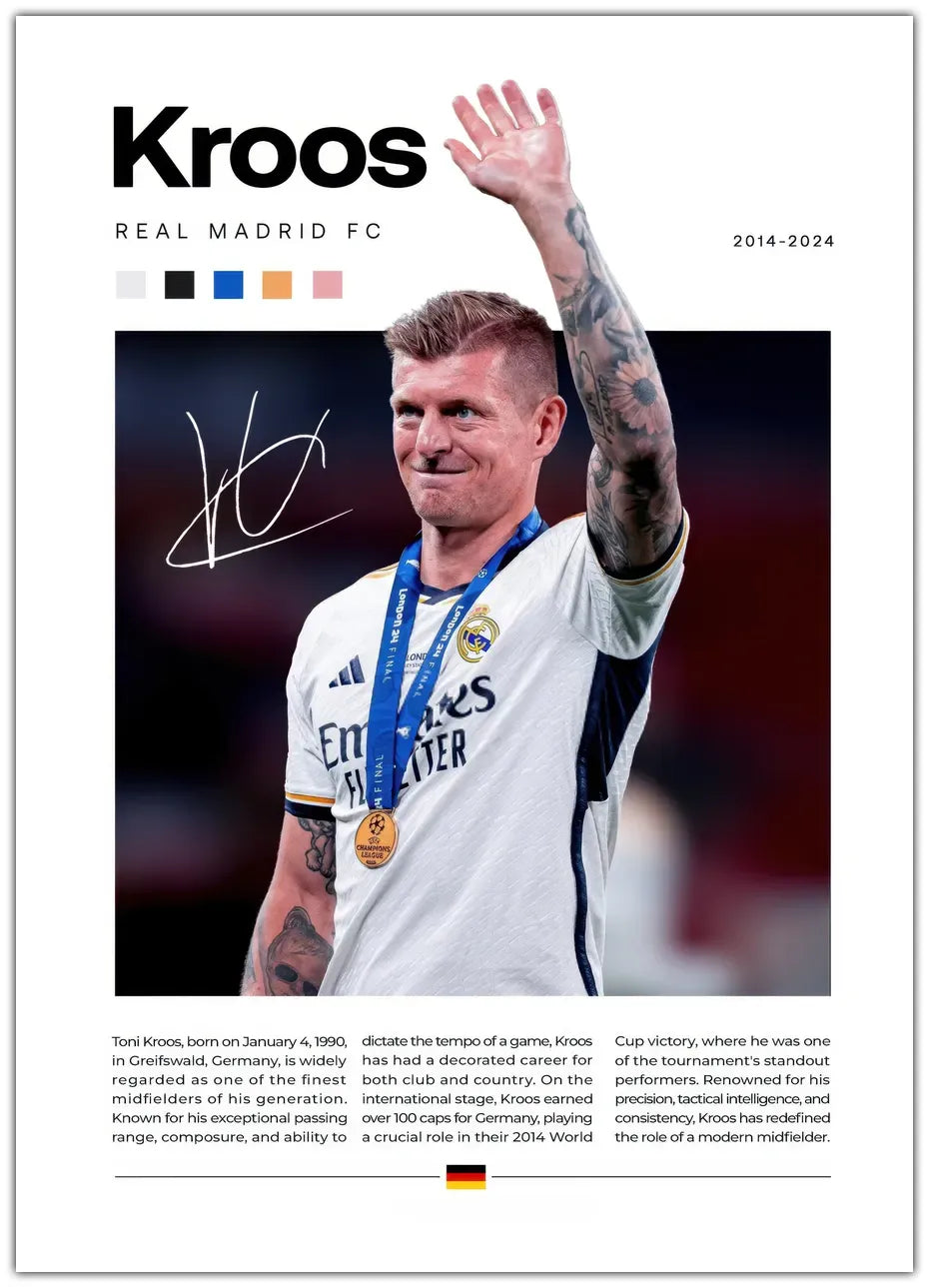 Toni Kroos er en tysk midtbanespiller, kendt for sin teknik, præcise pasninger og spilintelligens. Han har spillet for Real Madrid og det tyske landshold.