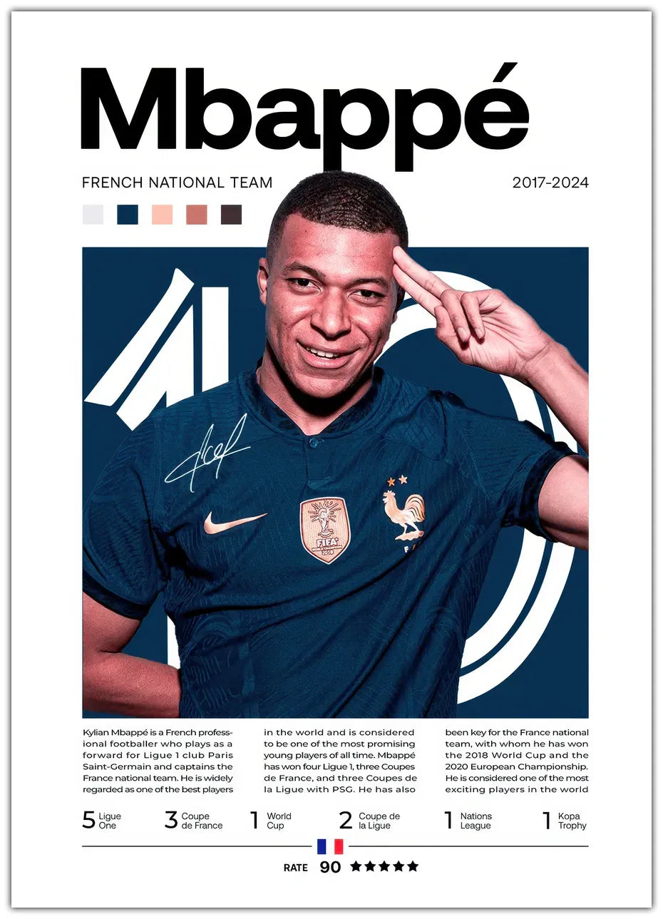 Kylian Mbappé er en af de mest talentfulde og spændende spillere i verdensfodbold. Denne plakat fejrer hans bemærkelsesværdige karriere, hvor han har opnået storhed både på klub- og landsplan. Som en afgørende spiller for PSG og det franske landshold har Mbappé vundet flere titler, herunder verdensmesterskabet i 2018 og UEFA Nations League i 2021. Hans eksplosive hastighed, tekniske evner og målscorende kraft har gjort ham til en af fodboldens store stjerner.