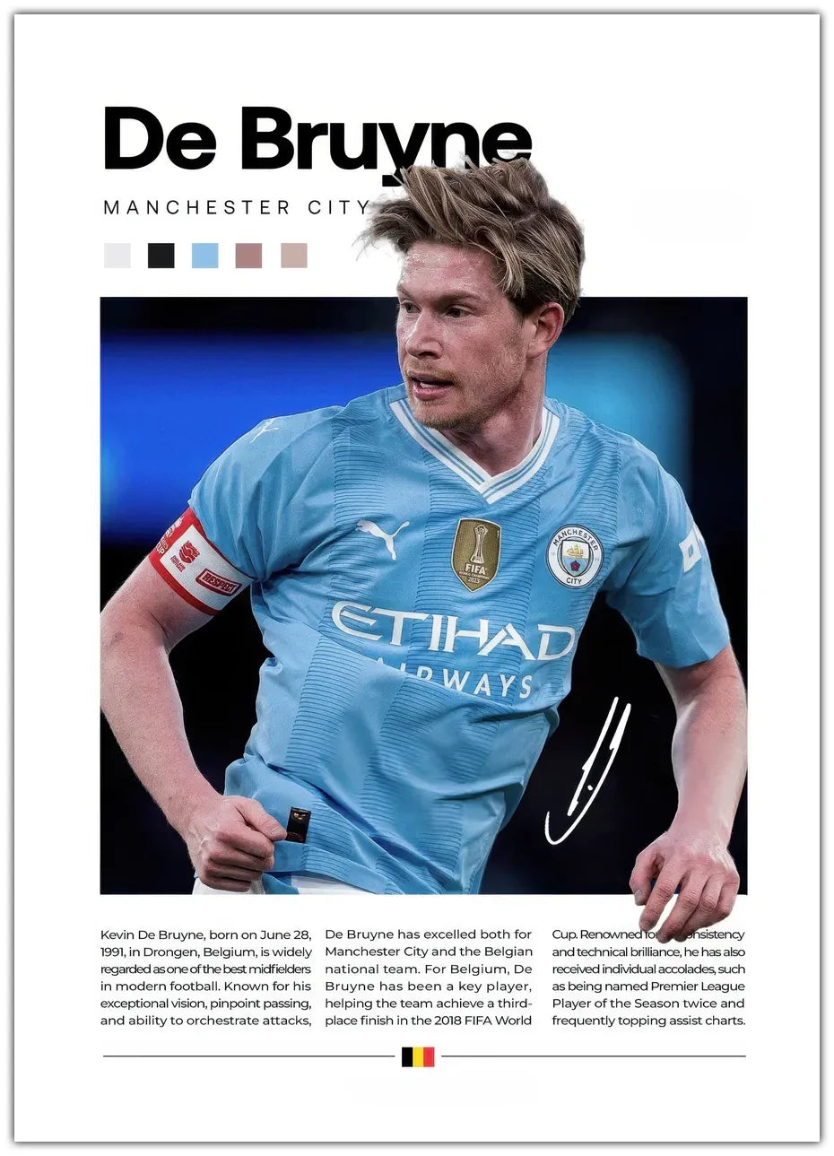 Denne plakat hylder Kevin De Bruyne, en af de bedste midtbanespillere i verden. Født i Belgien i 1991, er De Bruyne kendt for sin enestående vision og præcise afleveringer. Hans tekniske færdigheder og spilforståelse gør ham til en uundværlig spiller for både Manchester City og det belgiske landshold.