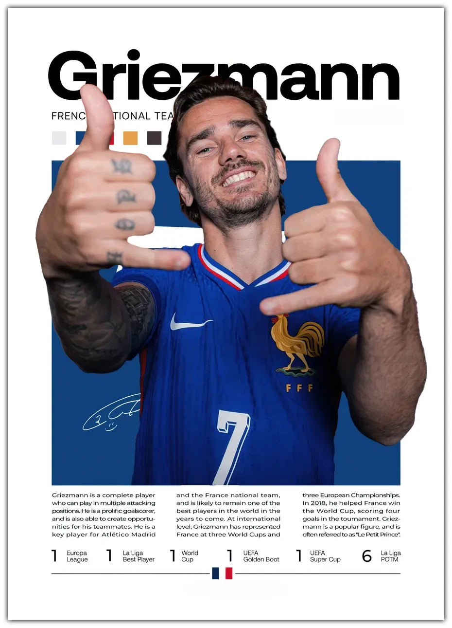 Griezmann No. 2 er en dynamisk plakat, der fremhæver hans kreative spil, præcise pasninger og afgørende mål, der har sat sit præg på både klub- og landskampshistorie.
