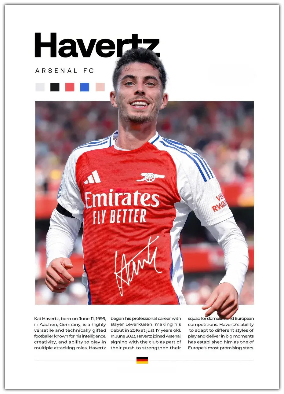 Med et dynamisk billede af Havertz i sin Arsenal-trøje, underskrevet med hans personlige signatur, bringer plakaten liv og stil til ethvert værelse. Den minimalistiske design med farvepaletten, der refererer til Havertz’ holdfarver, gør den til en perfekt tilføjelse til din samling af fodboldmemorabilia eller som et statement i din indretning.