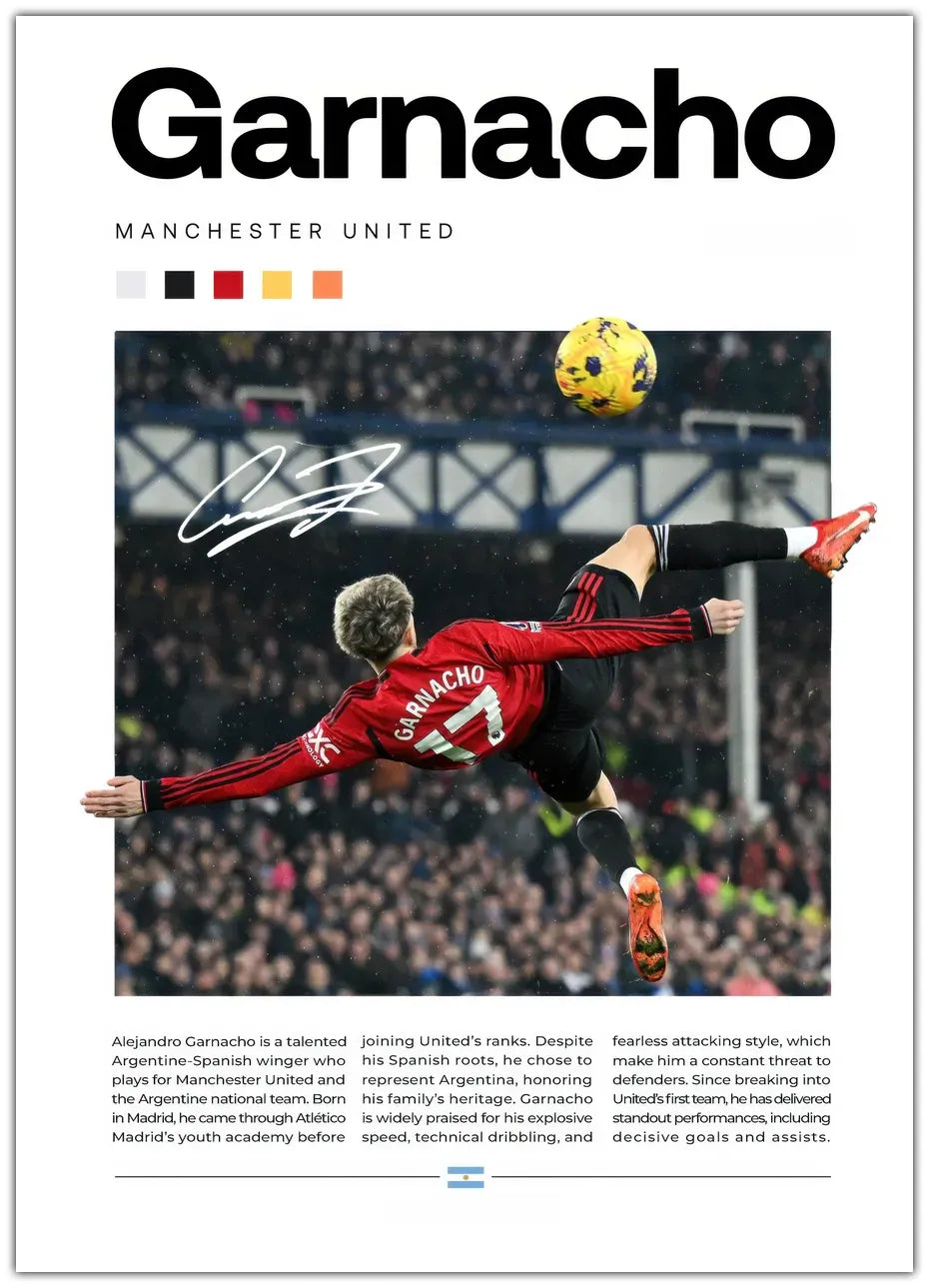 Alejandro Garnacho er en spændende plakat, der hylder hans ungdommelige energi, eksplosive fart og evne til at skabe uforglemmelige øjeblikke på banen.