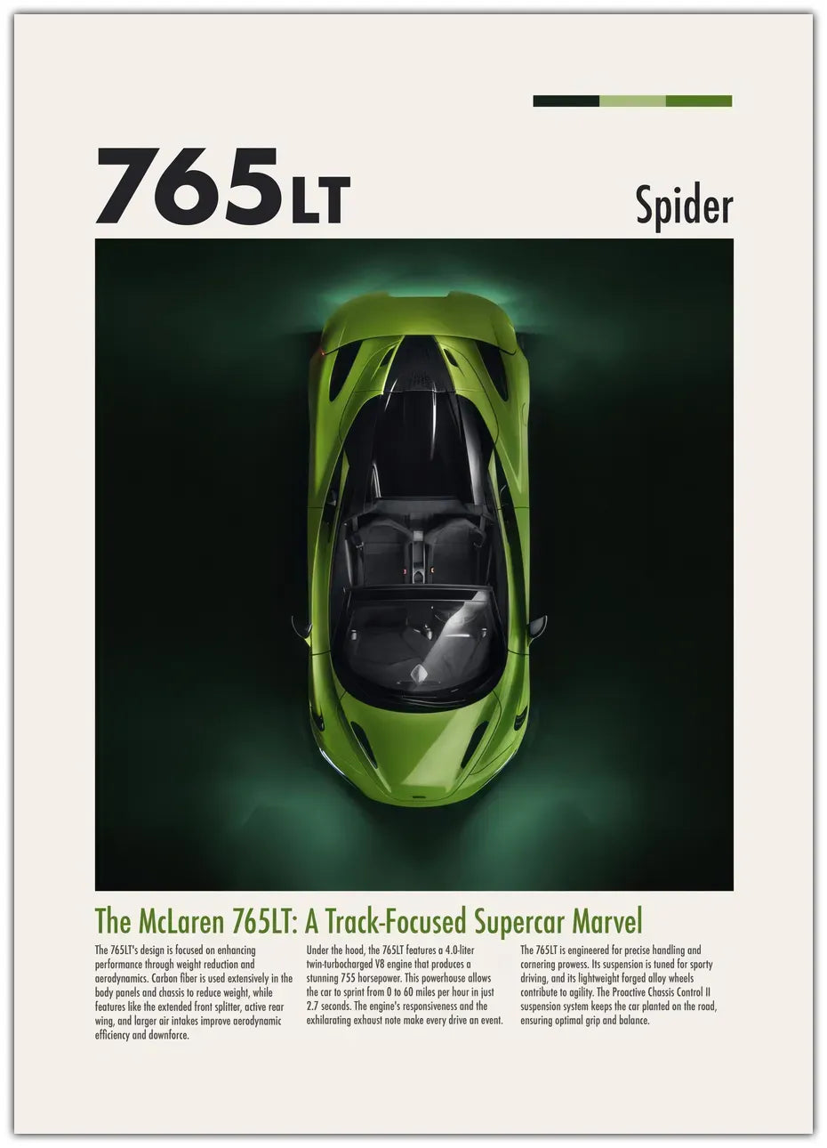 McLaren 765LT Spider: Følelsen af frihed! Tag på en uforglemmelig køretur under åben himmel med vores plakat, der indfanger den ubegrænsede spænding og rå kraft i McLarens 765LT Spider uden tag.