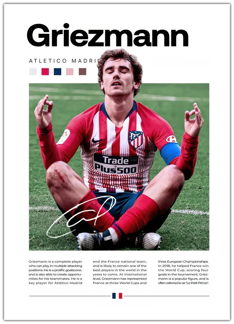 “Griezmann Plakat” hylder den franske stjernespiller i hans ikoniske Atletico Madrid-trøje. Motivet fanger et af hans mest genkendelige øjeblikke – fuld af ro, fokus og karisma – perfekt til enhver fodboldelsker, der vil have lidt passion på væggen.