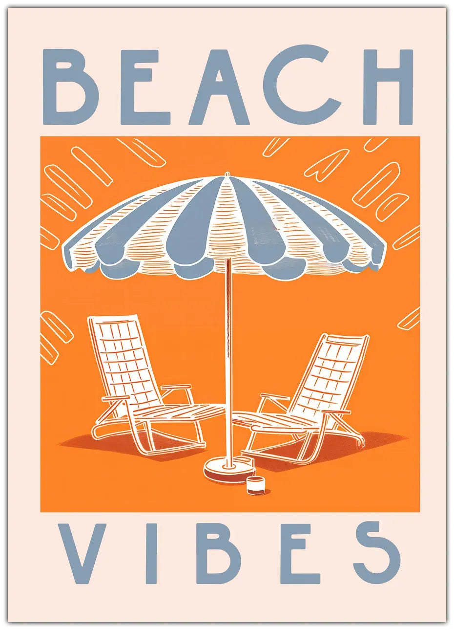 “Beach Vibes Plakat” spreder den afslappede feriestemning fra solrige dage på stranden. Det farverige motiv med to strandstole og en klassisk parasol i orange og blå nuancer bringer varme og glæde ind i dit hjem. En perfekt plakat til dig, der elsker sol, sommer og gode vibes.