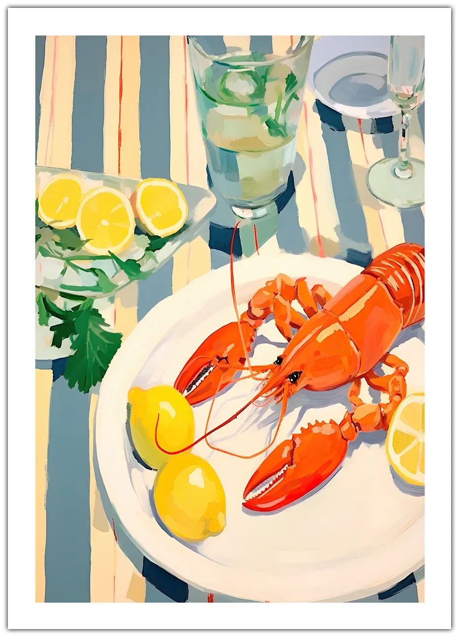 “Better With Lobster Plakat” bringer en stemning af sol, hav og ferieminder direkte ind i hjemmet. Det levende motiv med hummer, citroner og glas i sollys giver følelsen af en hyggelig middag ved kysten – afslappet, smagfuld og fuld af liv.