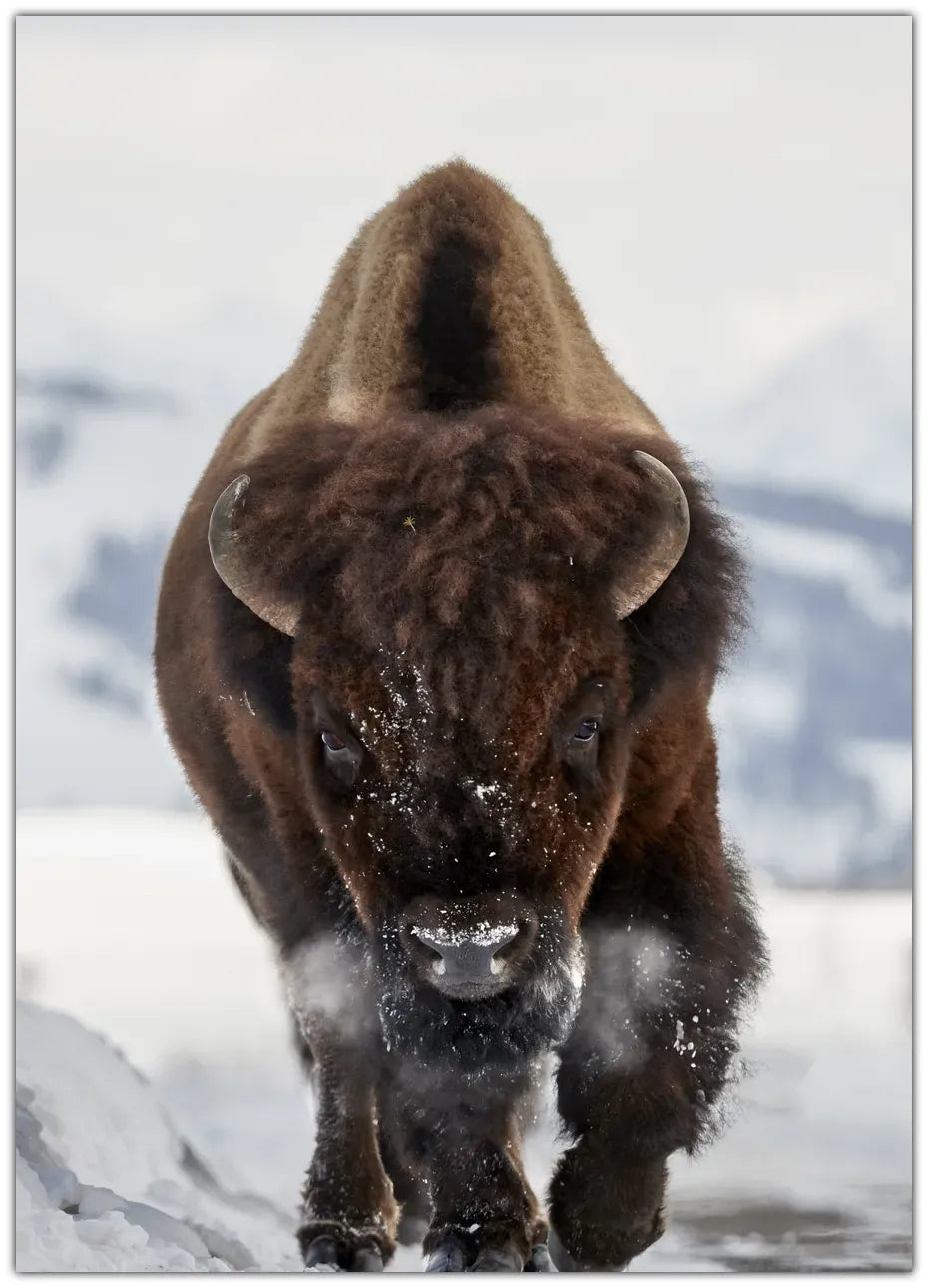 “Bison Incoming Plakat” fanger det rå øjeblik, hvor naturens kraft møder vinterens stilhed. Den majestætiske bison bevæger sig frem gennem sneen – et symbol på styrke, overlevelse og frihed.
