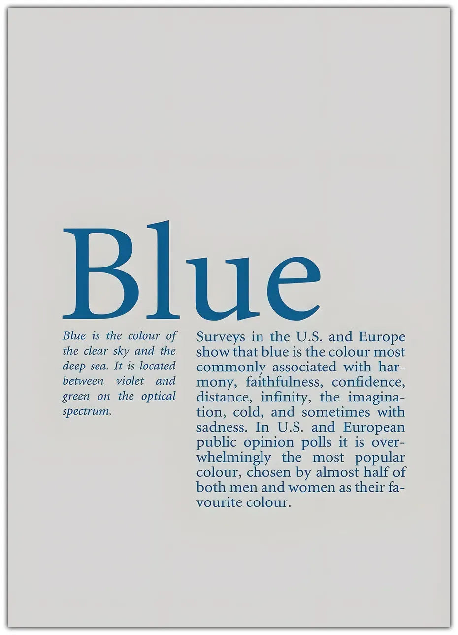 Plakaten beskriver farven blå som et symbol på ro, selvtillid og harmoni – kvaliteter, der passer perfekt ind i både hjem og kontor. Det enkle layout og den afbalancerede farvesammensætning gør den nem at matche med andre kunstværker eller hænge alene som et diskret statement.