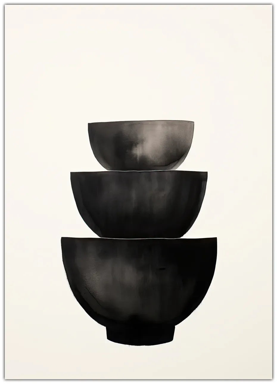 Bowls Plakat er et minimalistisk kunstværk, der udstråler ro og balance. De tre skåle, malet i forskellige nuancer af sort, er stablet oven på hinanden og danner et harmonisk udtryk, der indbyder til fordybelse. Motivet kombinerer enkelhed og dybde på elegant vis og passer perfekt til moderne, nordisk indretning.