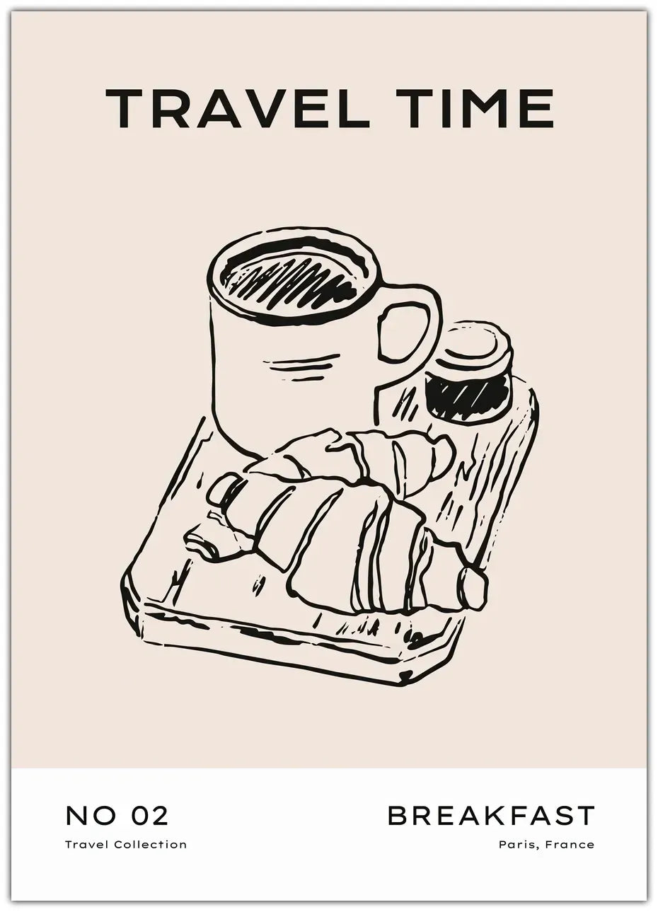 “Breakfast In Paris” plakaten indfanger charmen ved en klassisk fransk morgen – kaffe, croissanter og tid til at nyde livet. Det enkle, håndtegnede design kombineret med den lyse baggrund skaber et moderne og afslappet udtryk, der passer perfekt ind i både køkkenet og spisestuen.