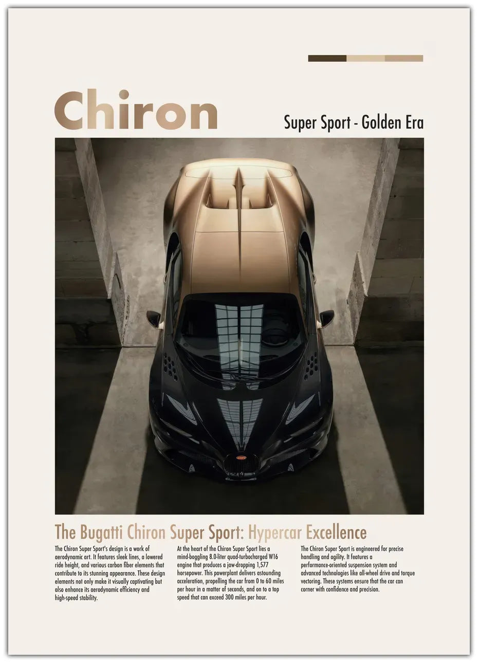 Bugatti Chiron Super Sport: Toppræstation og uovertruffen elegance! Tag på en rejse gennem luksusens rige med vores plakat, der hylder Bugatti Chiron Super Sports avantgarde-design og banebrydende ydeevne.
