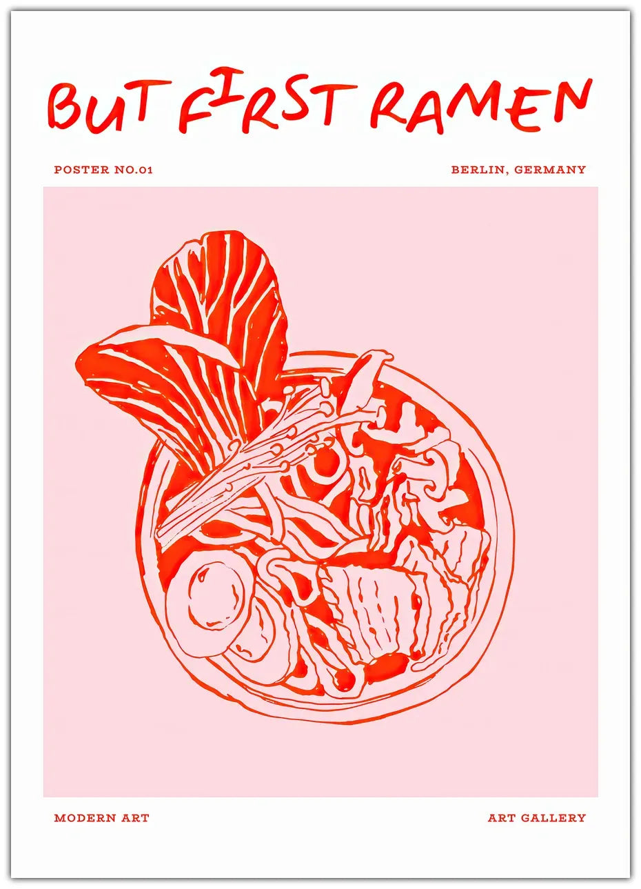 “But First Ramen” plakaten er et must-have for enhver, der elsker ramen, design og farver med attitude. Motivet viser en rød-hvid illustration af en skål dampende ramen, og kombinationen af moderne typografi og legende farver giver plakaten et friskt og energisk udtryk.
