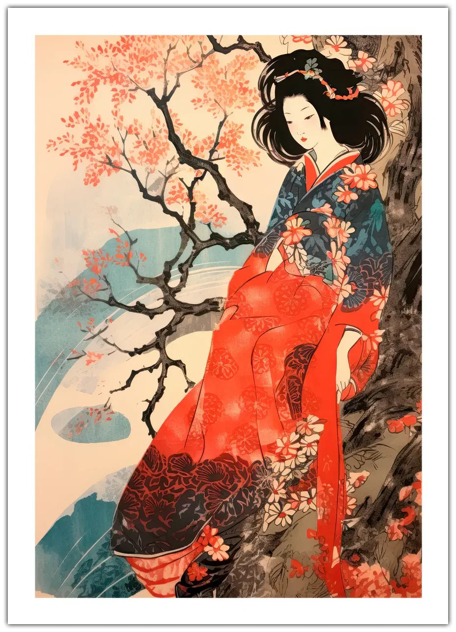 “By Nature” plakaten indfanger skønheden i klassisk japansk kunst med en moderne elegance. Motivet viser en kvinde i en farverig kimono omgivet af blomstrende kirsebærtræer, hvilket skaber en rolig og poetisk stemning. Farvesammensætningen af varme røde og bløde blå nuancer bringer harmoni og balance til rummet.