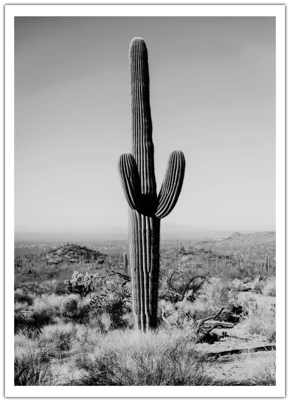 “Cactus Black And White” plakaten fanger den rå skønhed fra ørkenens landskab i et tidløst sort-hvidt udtryk. Den høje kaktus står som et symbol på styrke, ro og overlevelse – et perfekt motiv til dig, der elsker minimalistisk design med naturlig karakter.