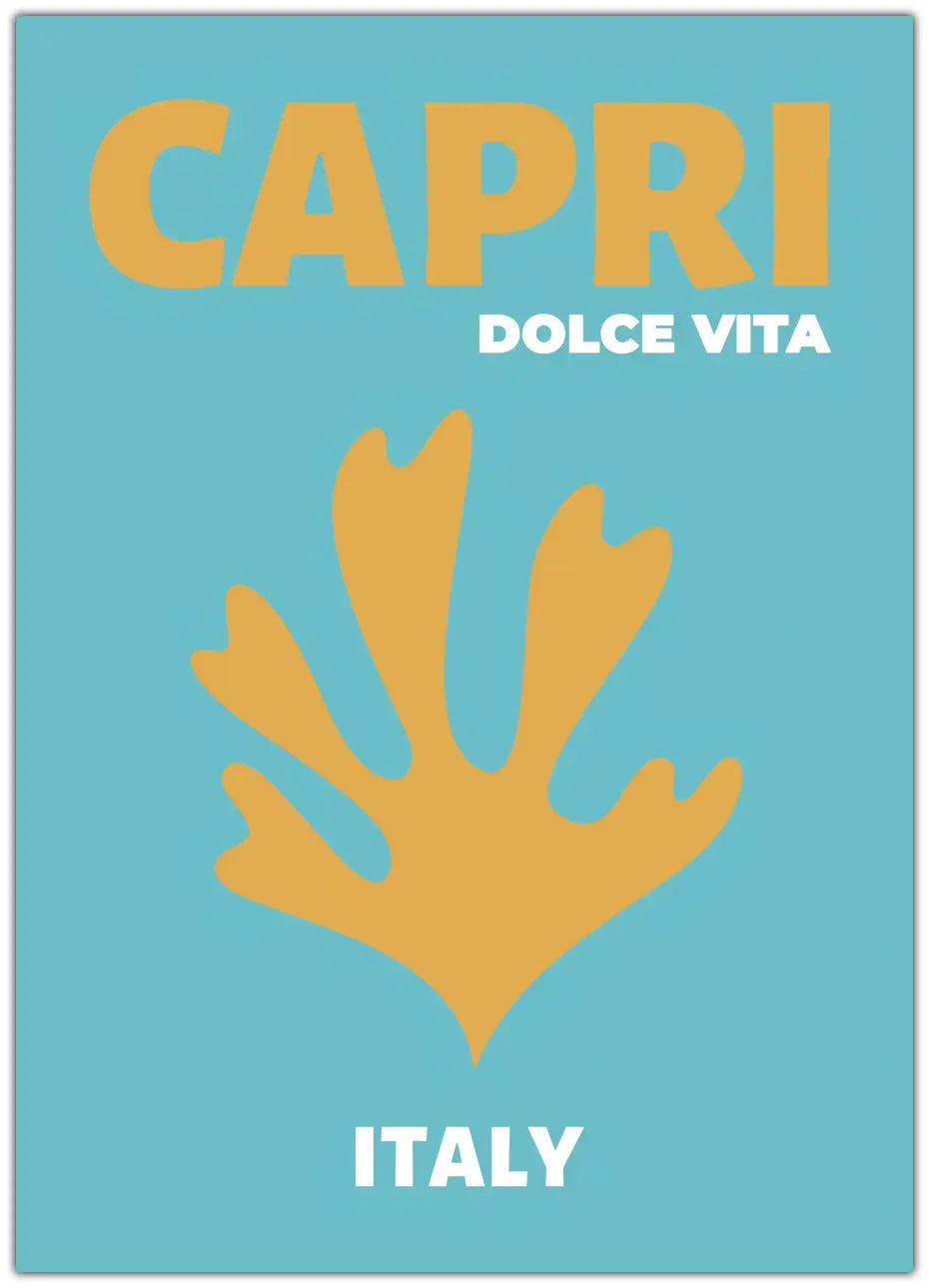 En stilren plakat med typografisk design, der hylder Capri og dens tidløse elegance – perfekt til dem, der elsker rejseinspireret kunst.