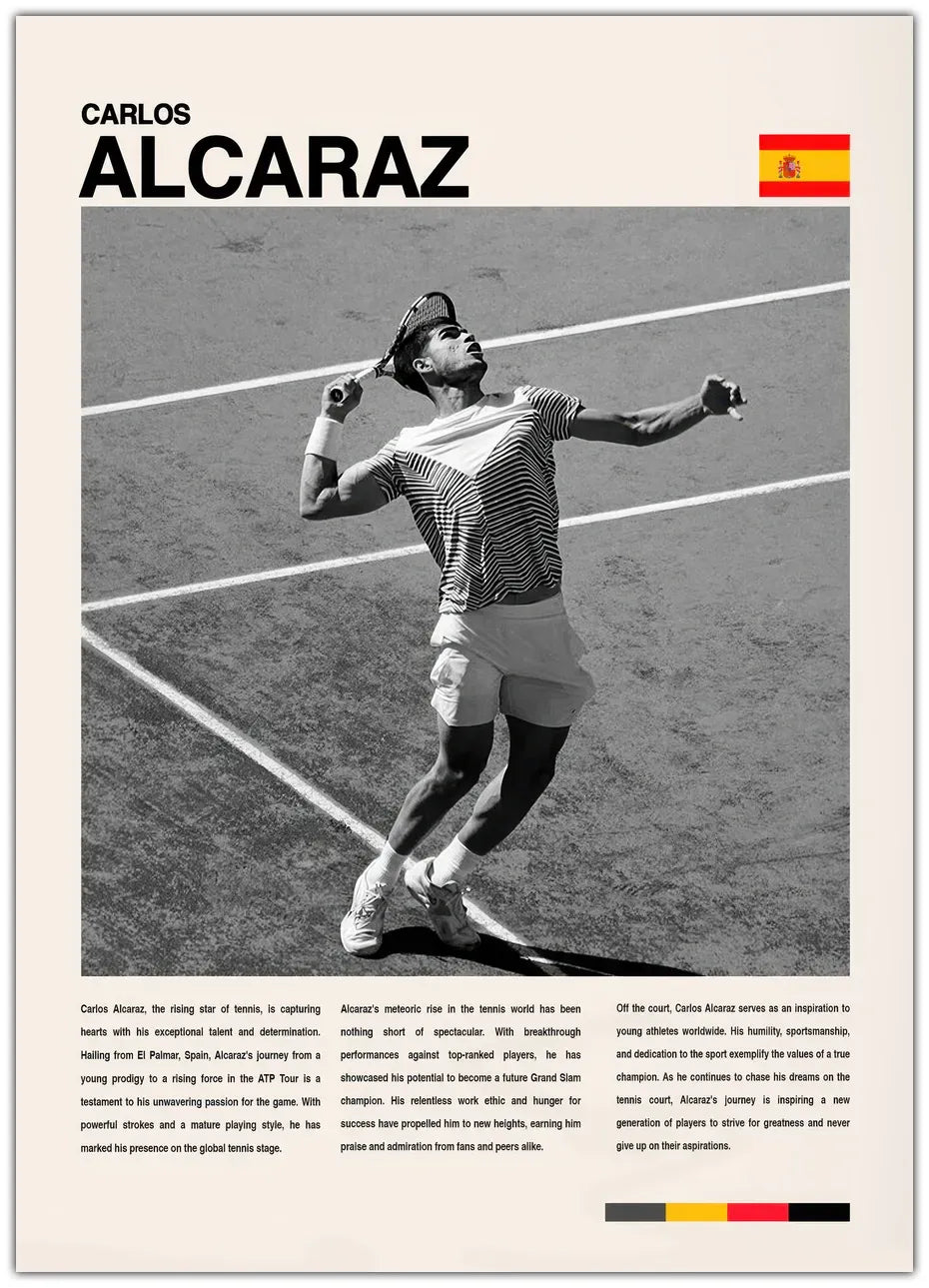 "Carlos Alcaraz: En imponerende plakat, der hylder Carlos Alcaraz' talent og bidrag til tennisverdenen. Perfekt til enhver fan af sporten, denne plakat fejrer en af tennisens lovende stjerner. Billedkredit til 350z33. Licens: CC BY 4.0."