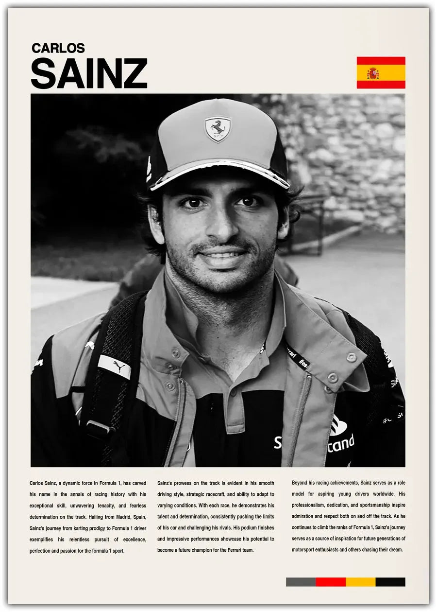 "Carlos Sainz: En inspirerende plakat, der hylder Carlos Sainz' imponerende præstationer og bidrag til motorsportverdenen. Perfekt til enhver fan af racingsport, denne plakat fejrer en af Formel 1s mest talentfulde og hårdtarbejdende kørere. Billedkredit til Dorian Schuster. Licens: CC BY 4.0."