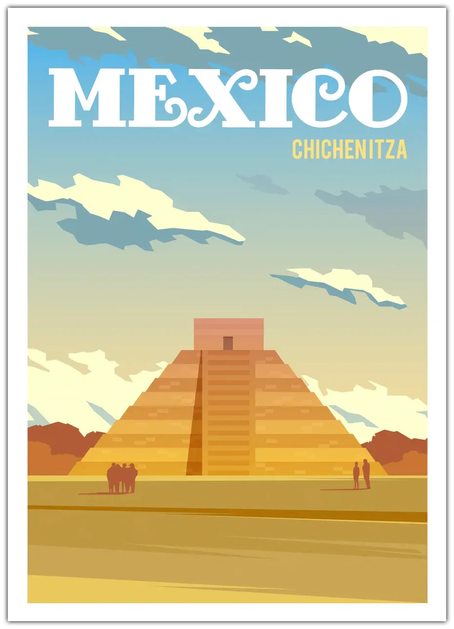 Udforsk Mexicos rige historie med vores "Chichenitza" plakat. Denne imponerende illustration fanger storheden af de gamle Maya-ruiner, og bringer en følelse af kulturel arv og mystik ind i dit hjem.