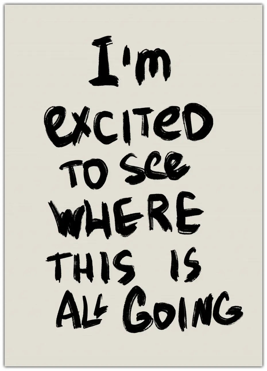 En optimistisk plakat med teksten "Excited To See Where This Is Going" i en stilfuld og legende typografi, perfekt til at tilføje en følelse af spænding og forventning til ethvert rum.