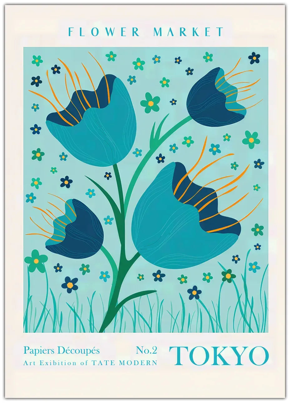 Flower Market Tokyo plakaten bringer et strejf af modernitet og ro med sine smukke blå nuancer og blomstrende detaljer. Et stilrent design, der skaber en beroligende atmosfære og passer perfekt ind i enhver moderne boligindretning.