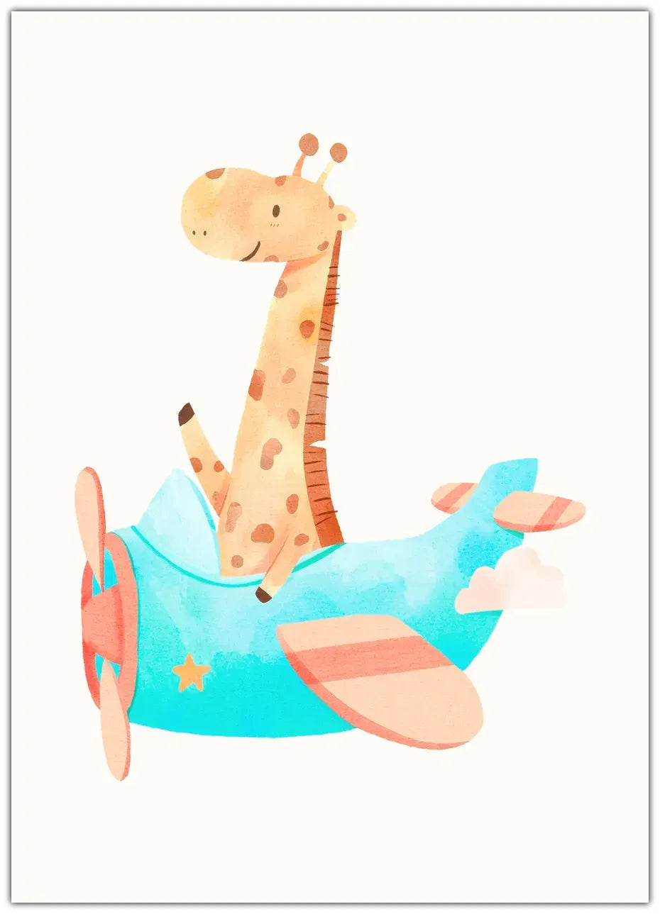 Flying Giraffe: En fantasifuld børneplakat, der viser en giraf svævende gennem skyerne med vinger, bringer magi og leg til børneværelset.
