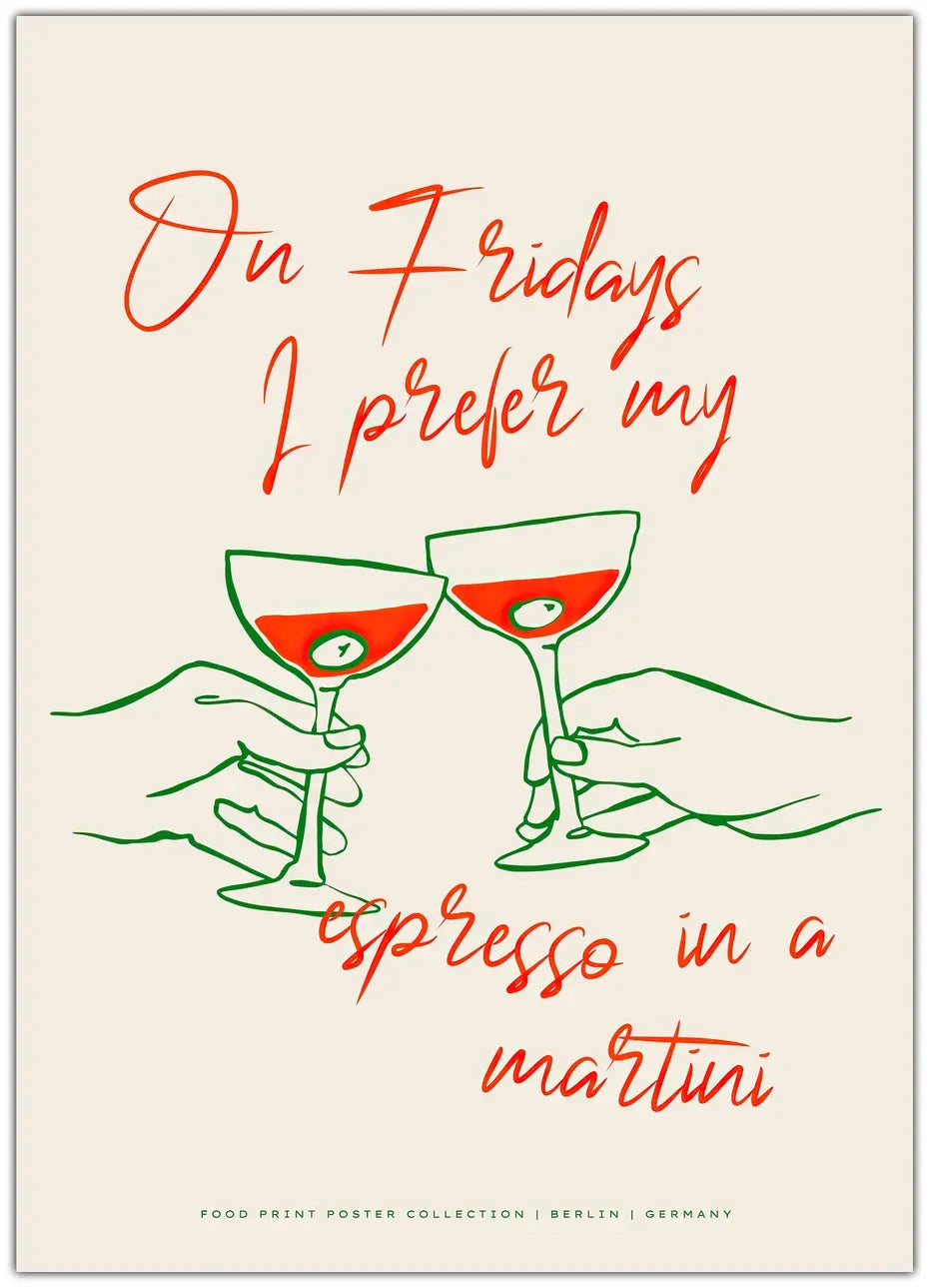 Skab den perfekte stemning for fredagsaftener med vores "Fridays With Martini" plakat. Et stilfuldt udtryk for den afslappede elegance og feststemning, der følger med en Martini i hånden.