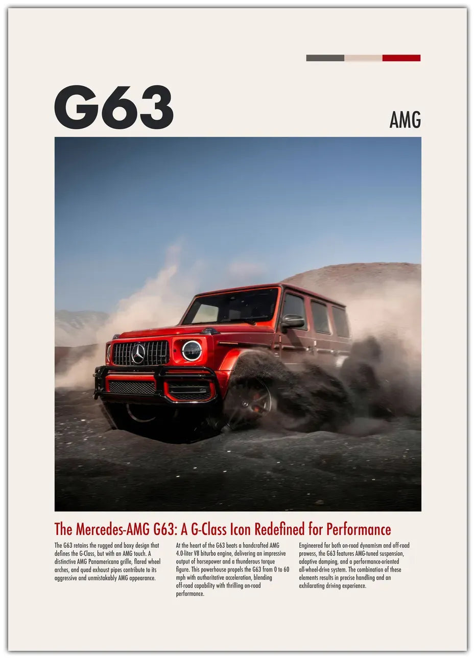 Mercedes-AMG G63: Uovertruffen luksus og terrængående ydeevne! Oplev legenden med vores plakat, der hylder Mercedes-AMG G63's ikoniske design og imponerende køreegenskaber.