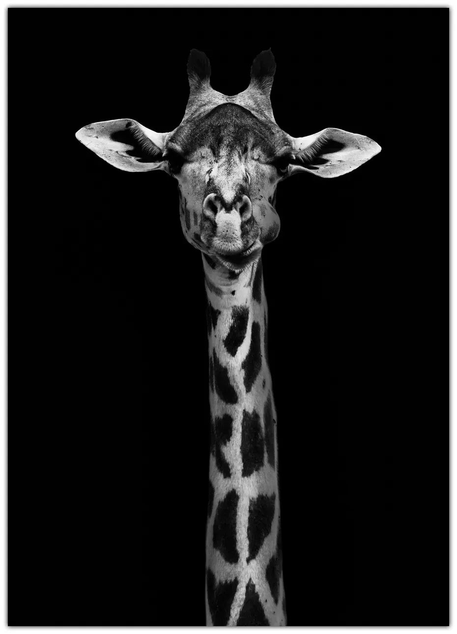 “Giraffe Portrait Plakat” fanger den majestætiske giraf i et minimalistisk, sort-hvidt udtryk. Det stærke kontrastspil og de fine detaljer i motivet giver en rolig, men samtidig kraftfuld stemning. En dyre plakat, der både udstråler styrke og elegance.