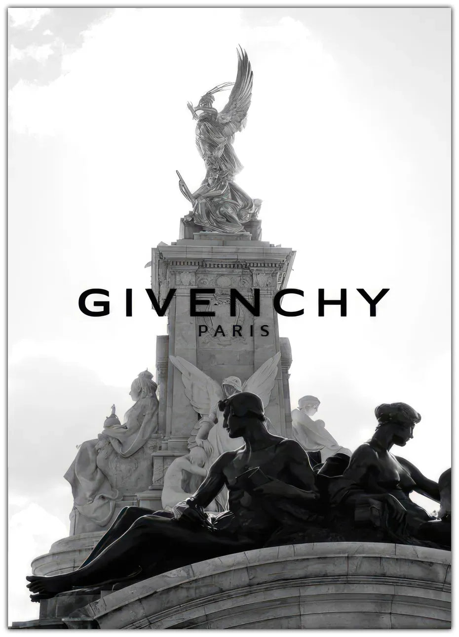 Fremhæv elegance med vores "Givenchy Paris" plakat, hvor statuer pryder en klassisk bygning. Et ikonisk billede, der indfanger Givenchys raffinerede stil og den historiske charme i Paris. Perfekt til at tilføje en følelse af luksus og kultur til dit hjem eller kontor.