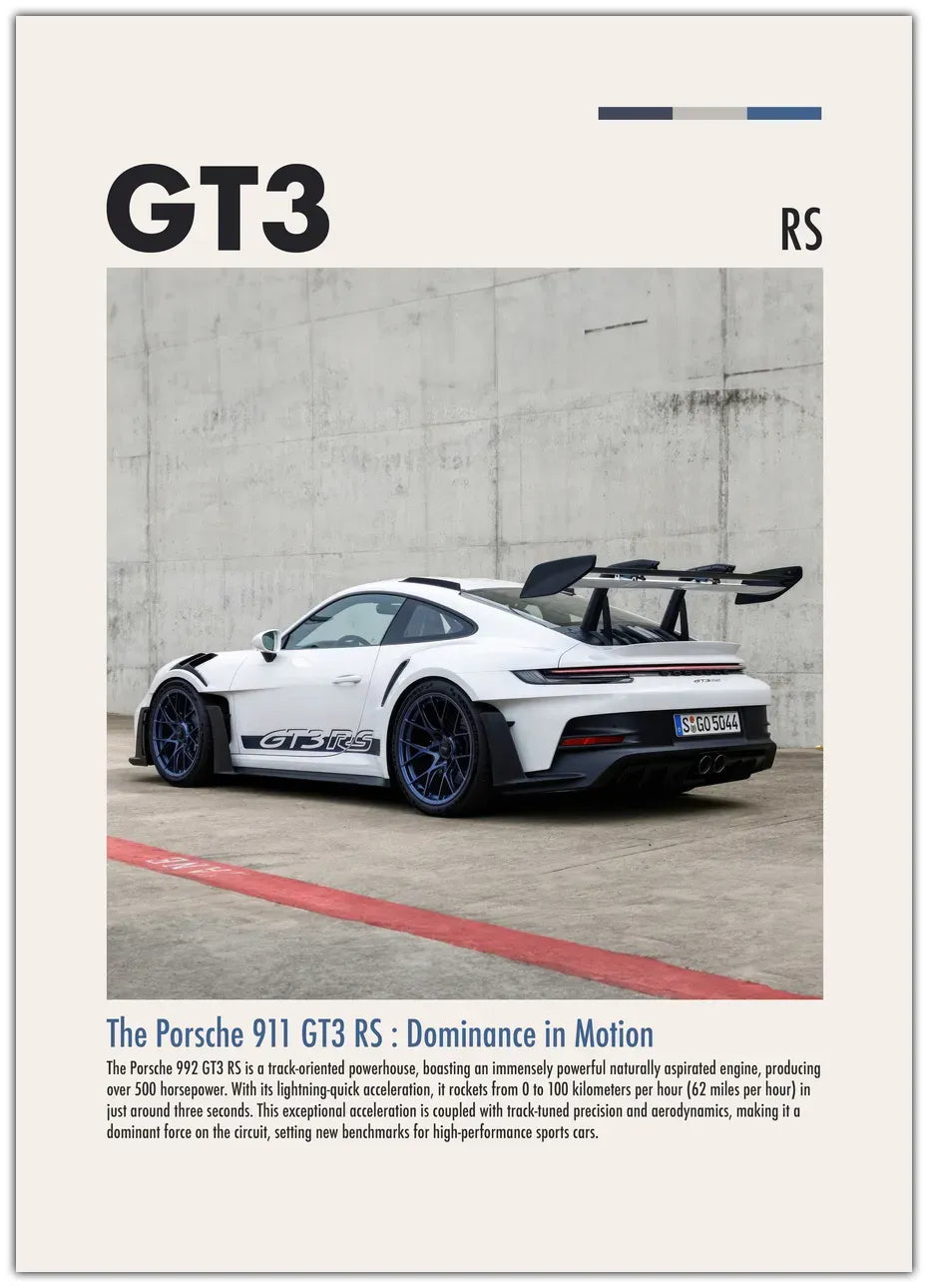 Porsche 911 GT3 RS: Præcision og kraft i perfekt balance! Udforsk ydeevne i verdensklasse med vores plakat, der hylder Porsche 911 GT3 RS' legendariske design og enestående præstationer.