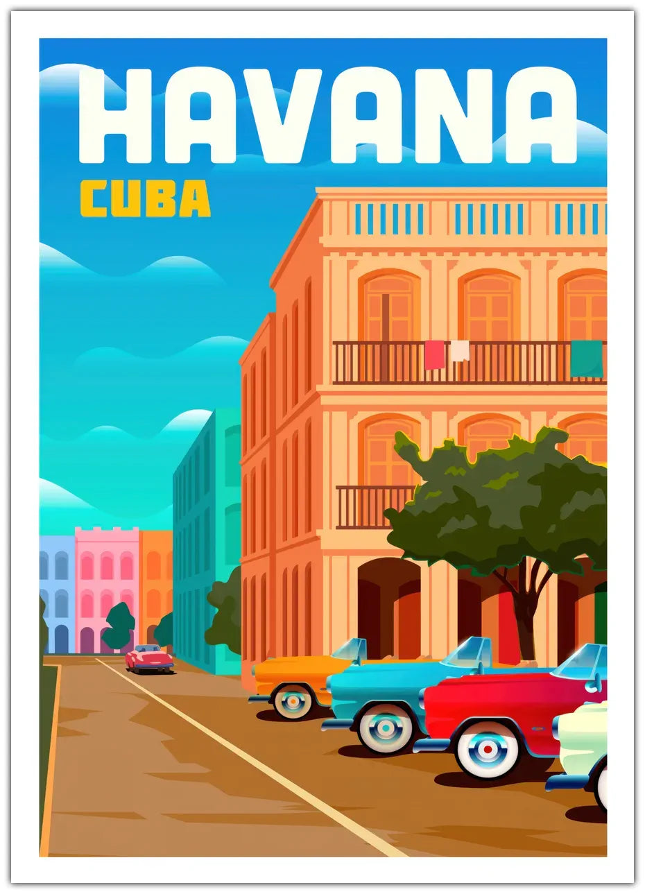Plakaten viser den ikoniske arkitektur i Havana, hvor pastelfarvede bygninger og vintage biler giver et autentisk indblik i Cubas rige kultur og historie. Dette kunstværk er en hyldest til byen og dens karakteristiske atmosfære, der fanger både nostalgi og moderne flair.