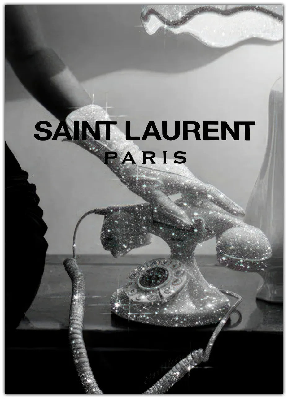 Denne plakat kombinerer tidløs glamour med moderne stil, hvor et glitrende telefonapparat og en elegant hånd er i fokus. Med den ikoniske Saint Laurent-logo og den luksuriøse følelse af glimmer og lys fanger plakaten essensen af sofistikeret mode og høj klasse.