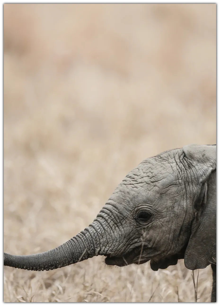 Denne plakat fanger et hjerteskærende sødt øjeblik af en baby elefant i naturen. Den bløde og detaljerede portræt af den unge elefant bringer både sødme og dybde til din vægdekoration. Med den varme, bløde baggrund skaber plakaten en følelse af ro og venlighed, perfekt til at tilføje et naturinspireret element til dit hjem.