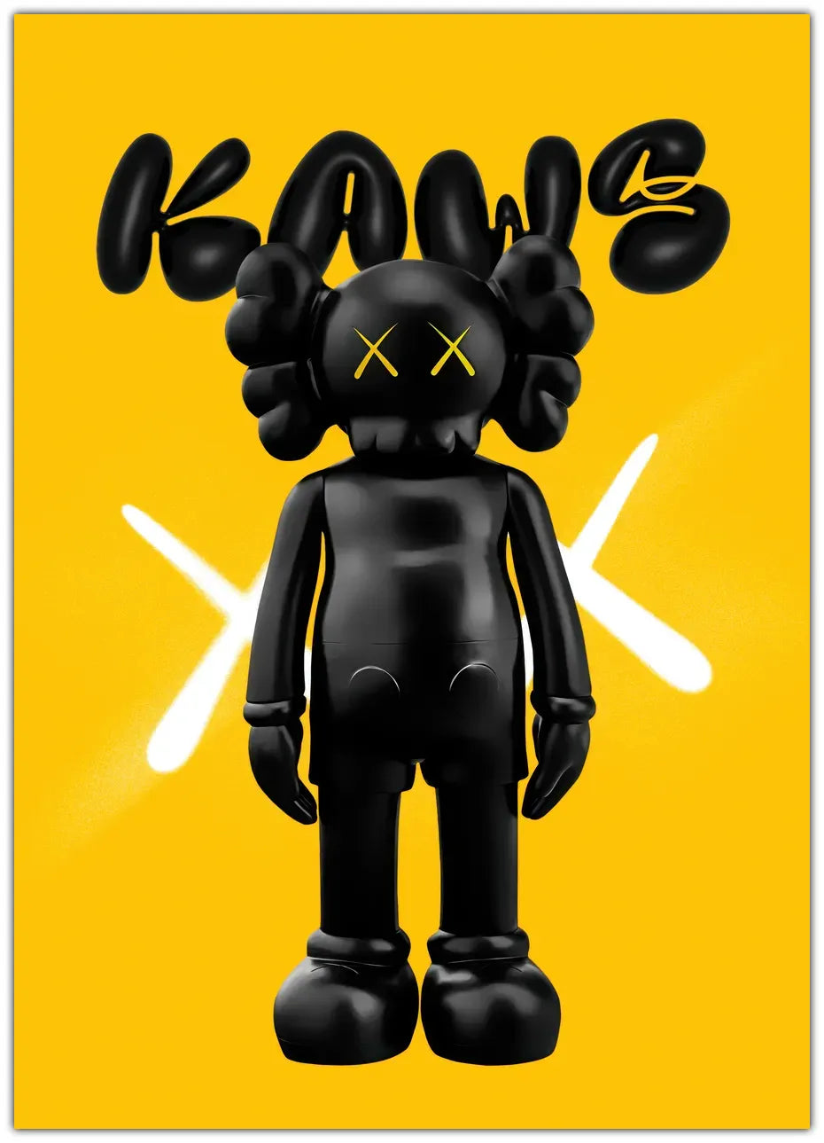 Denne plakat viser en af de mest genkendelige figurer skabt af den berømte kunstner Kaws. Den sorte karakter med de krydsede øjne er et symbol på Kaws' unikke tilgang til popkultur og kunst. Den livlige gule baggrund fremhæver figuren og skaber et visuelt statement, der tiltrækker opmærksomhed og vækker nysgerrighed.
