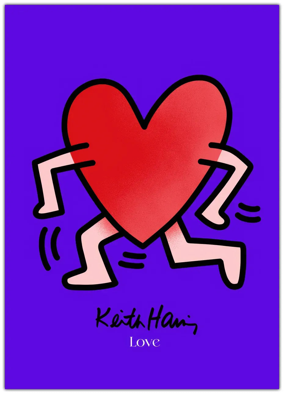 Denne plakat viser Keith Harings Love, et energisk kunstværk, hvor et stort rødt hjerte bevæger sig på ben af en glad og livlig figur. Den kontrasterende lilla baggrund fremhæver hjertet og skaber en dynamisk og farverig komposition, der udstråler positive følelser.