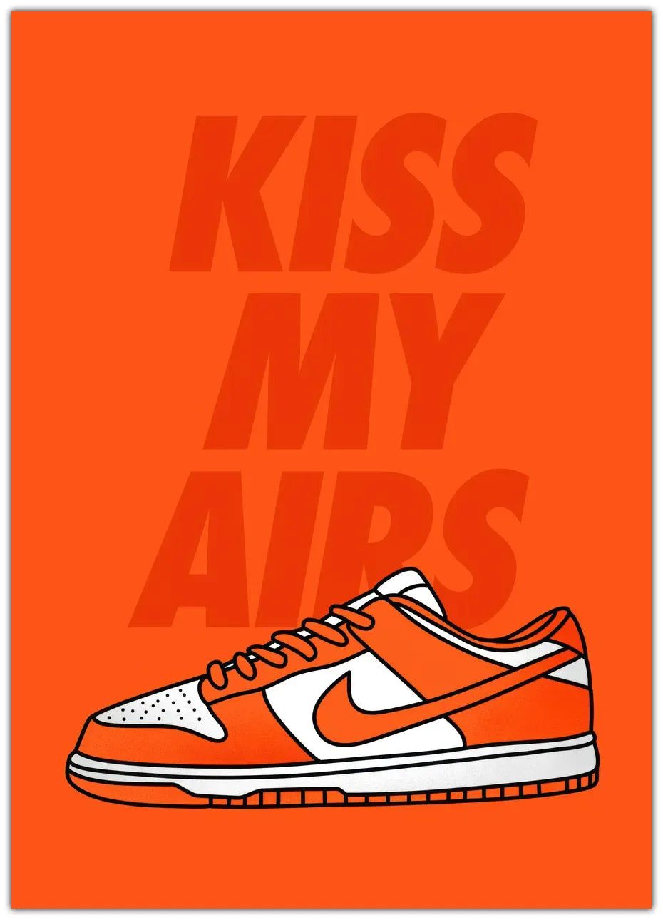 Denne plakat fejrer sneaker-kulturen med en stærk og humoristisk tagline: Kiss My Airs. Med en ikonisk Nike-sneaker i centrum og en lys orange baggrund fanger designet den boldhed og energi, der er forbundet med både mode og streetwear.