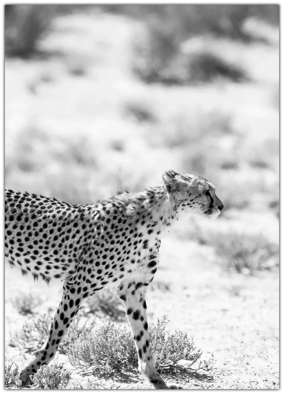 Geparden, kendt som den hurtigste landdyr, er et symbol på hastighed og præcision. Denne plakat indfanger dyrets rolige, men fokuserede udtryk, mens den vandrer gennem sit naturlige habitat. Det sort-hvide format giver et tidløst og kunstnerisk udtryk.