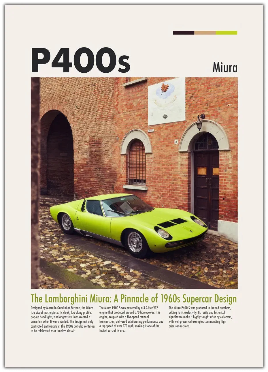 Lamborghini Miura: Pioneren af superbiler! Oplev tidløs elegance og banebrydende design med vores plakat, der hylder Lamborghini Miuras ikoniske arv og legendariske stil.