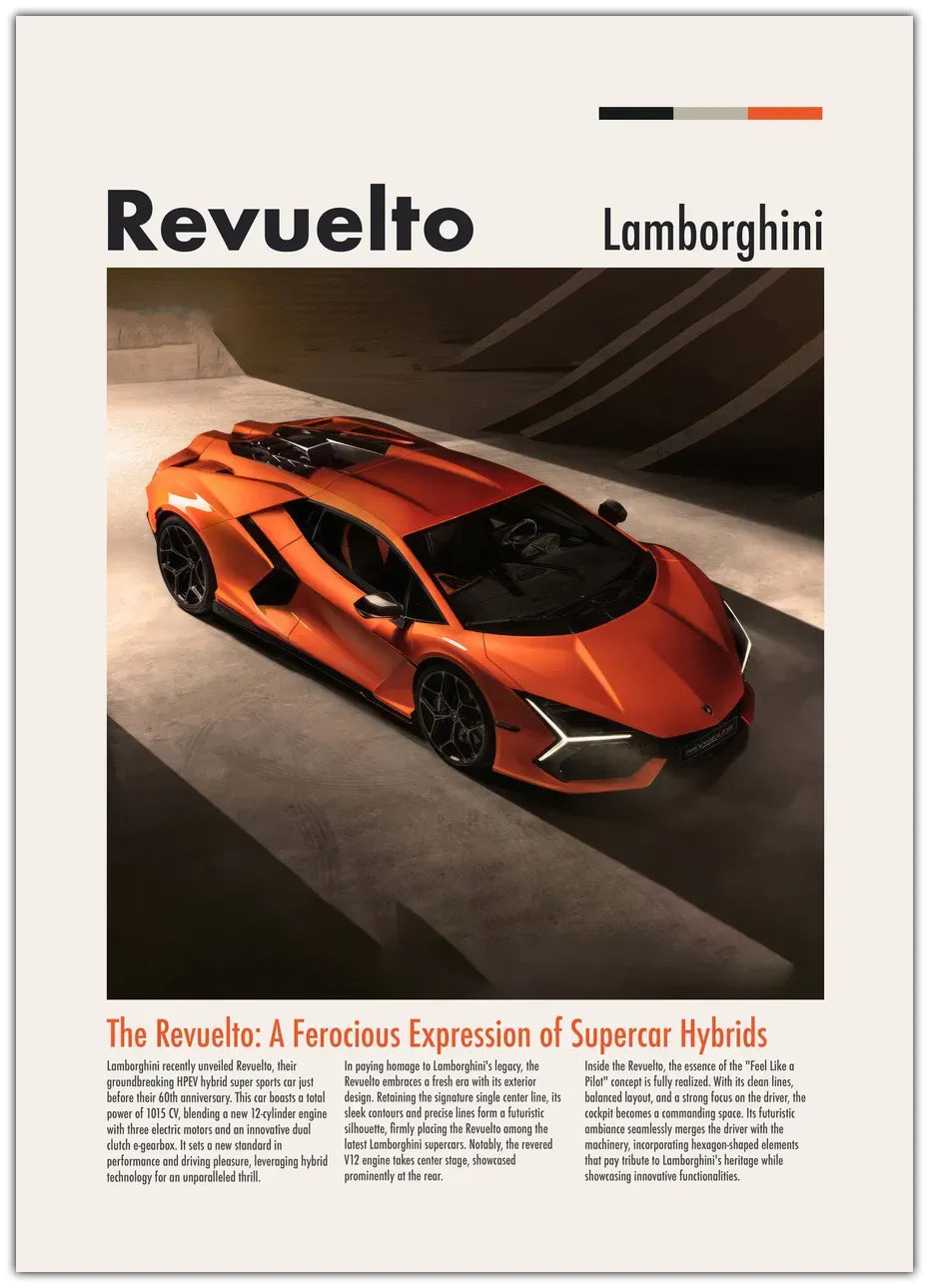 Denne plakat er ideel for samlere og bilentusiaster, der ønsker at ære en af de mest spændende og innovative biler i superbilens historie. Med sit kraftfulde design og fokus på fremtidens teknologi, vil Lamborghini Revuelto plakaten tilføre et luksuriøst og futuristisk præg til dit hjem eller kontor.