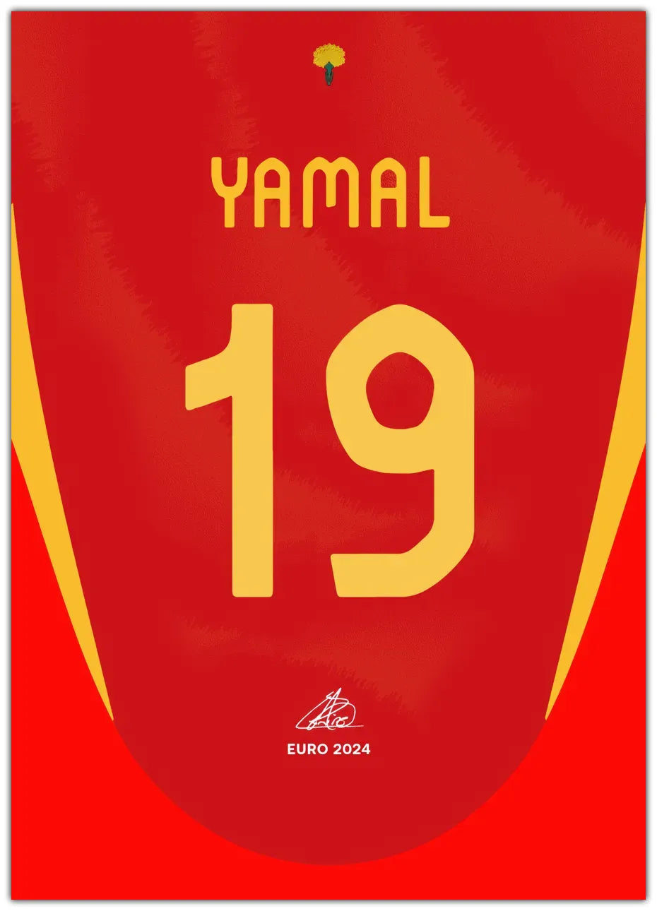 Denne plakat af Lamine Yamals trøje til Euro 2024 er et fantastisk stykke fodboldkunst. Designet fremhæver trøjen med nummeret 19 og Yamal's navn, hvilket gør plakaten både stilfuld og autentisk. De stærke rød-gule farver og det minimalistiske design giver et moderne og energisk udtryk, perfekt til enhver fodboldfan, der ønsker at hylde en af sportens nyeste stjerner.