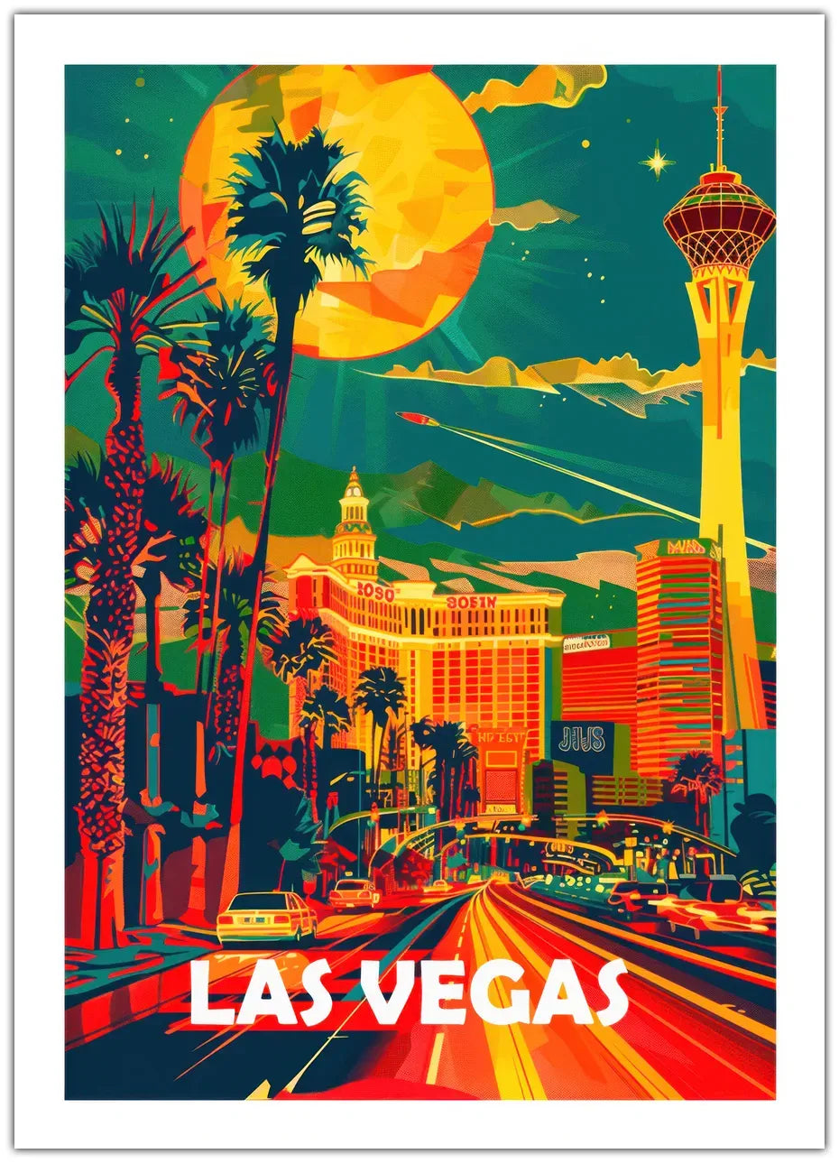 Oplev den elektriske stemning i Las Vegas med denne farverige plakat, der fanger byens ikoniske landskab i en stiliseret og livlig kunstform. Den dramatiske solnedgang og neonskiltene skaber en visuel fest, der bringer den pulserende energi fra Las Vegas direkte ind i dit hjem.