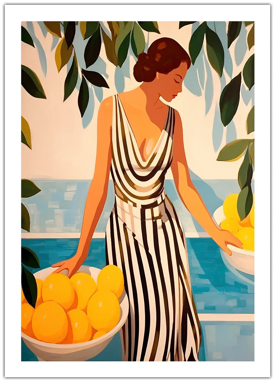 Oplev den elegante og livlige atmosfære i denne plakat, der viser en kvinde i en smuk stribet kjole, omgivet af citroner og grønne blade. De varme farver og den enkle, men stilfulde komposition skaber en rolig og indbydende stemning, perfekt til at tilføje et tropisk touch til dit hjem.