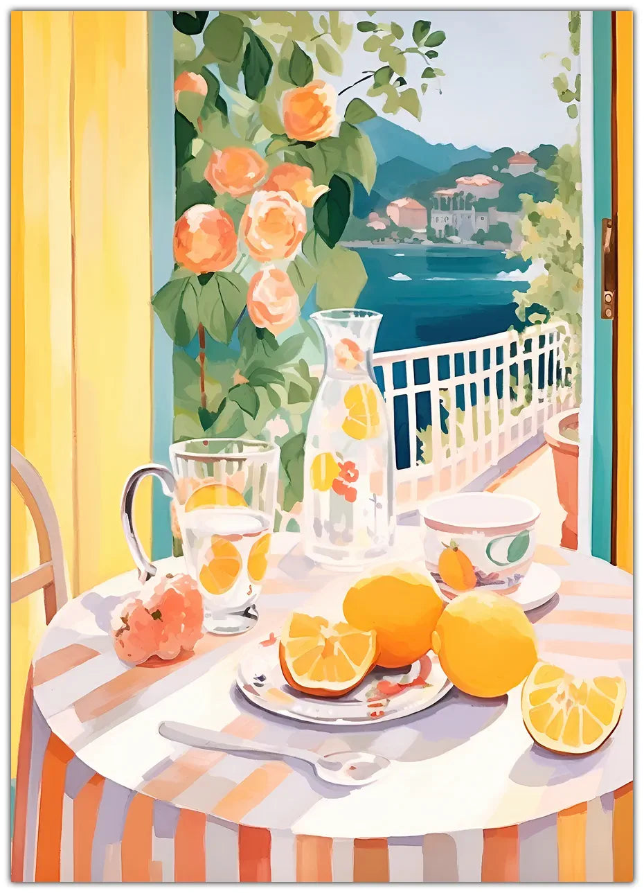 Oplev den solrige og forfriskende stemning med denne plakat, der fanger en smuk udendørs scene med citroner, blomster og et glas limonade. De varme farver og den smukke udsigt skaber en afslappende og indbydende atmosfære, perfekt til at tilføje et sommerligt touch til dit hjem.