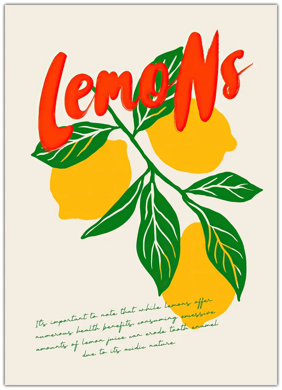 Tilføj et livligt og energisk element til dit hjem med denne plakat, der præsenterer citroner med en legende typografi. De stærke farver med de saftige citroner og grønne blade skaber et friskt og positivt udtryk, mens den informative tekst giver plakaten et lærerigt twist.