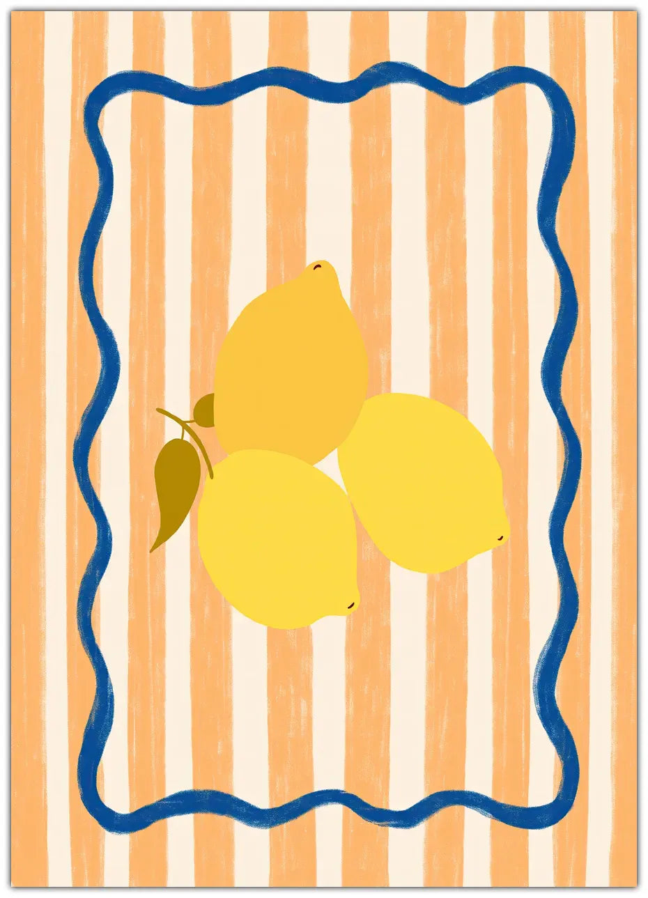 Tilføj et friskt og muntert touch til dit hjem med denne plakat, der præsenterer citroner på en baggrund af orange striber og blå ramme. De klare farver og det enkle, men iøjnefaldende design gør denne plakat til en perfekt tilføjelse til ethvert rum.