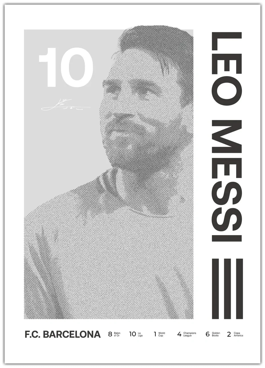 Plakaten kombinerer et elegant grafisk udtryk med et genkendeligt billede af Messi. De fine detaljer og typografien understreger hans præstationer gennem karrieren, mens det enkle layout gør plakaten let at matche med andre motiver.