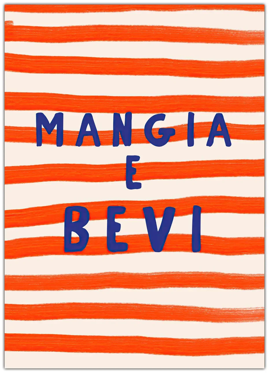 Mangia E Bevi Plakat fanger essensen af italiensk livsglæde med et farverigt og iøjnefaldende design. Med de levende orange striber og de blå bogstaver, der lyser op mod den enkle baggrund, bringer plakaten en energisk og indbydende atmosfære til dit hjem.