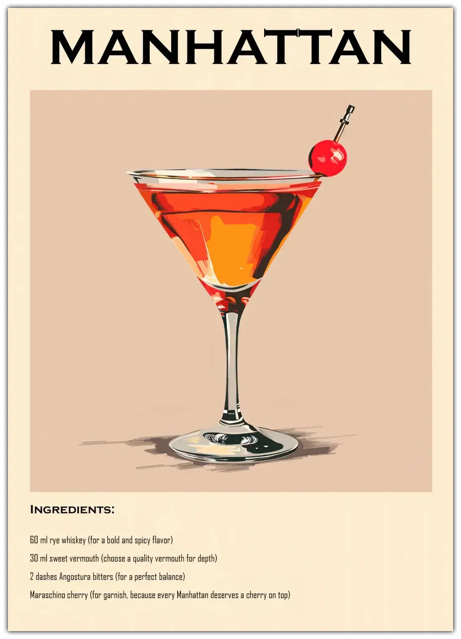 Manhattan Plakat er mere end blot en dekorativ genstand – den er en hyldest til tidløs elegance og de små detaljer, der gør en god cocktail uforglemmelig. En ideel gave til cocktailentusiaster eller som et sjovt og stilfuldt element i din indretning.