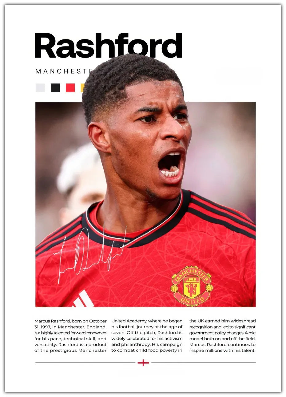 Med sit rene layout og flotte farver forener Marcus Rashford Plakat sport og æstetik på bedste vis. Den fungerer både som en hyldest til spillet og som et stilrent element, der bringer energi og personlighed ind i rummet.