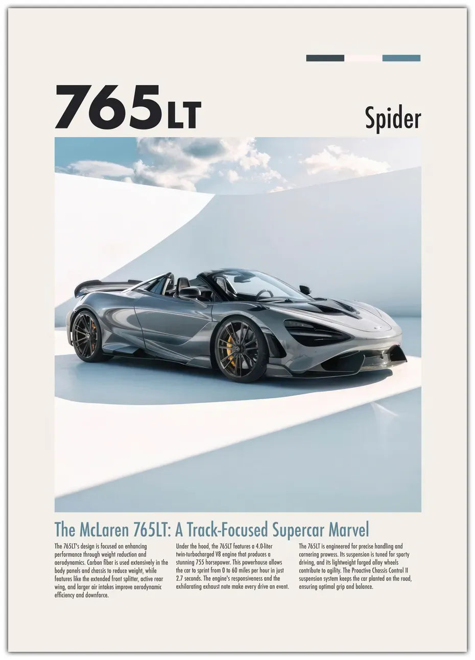 McLaren 765LT: Præcision og kraft i perfekt balance! Dyk ned i en verden af ultimativ ydeevne med vores plakat, der hylder McLarens 765LT's banebrydende teknologi og strålende design.